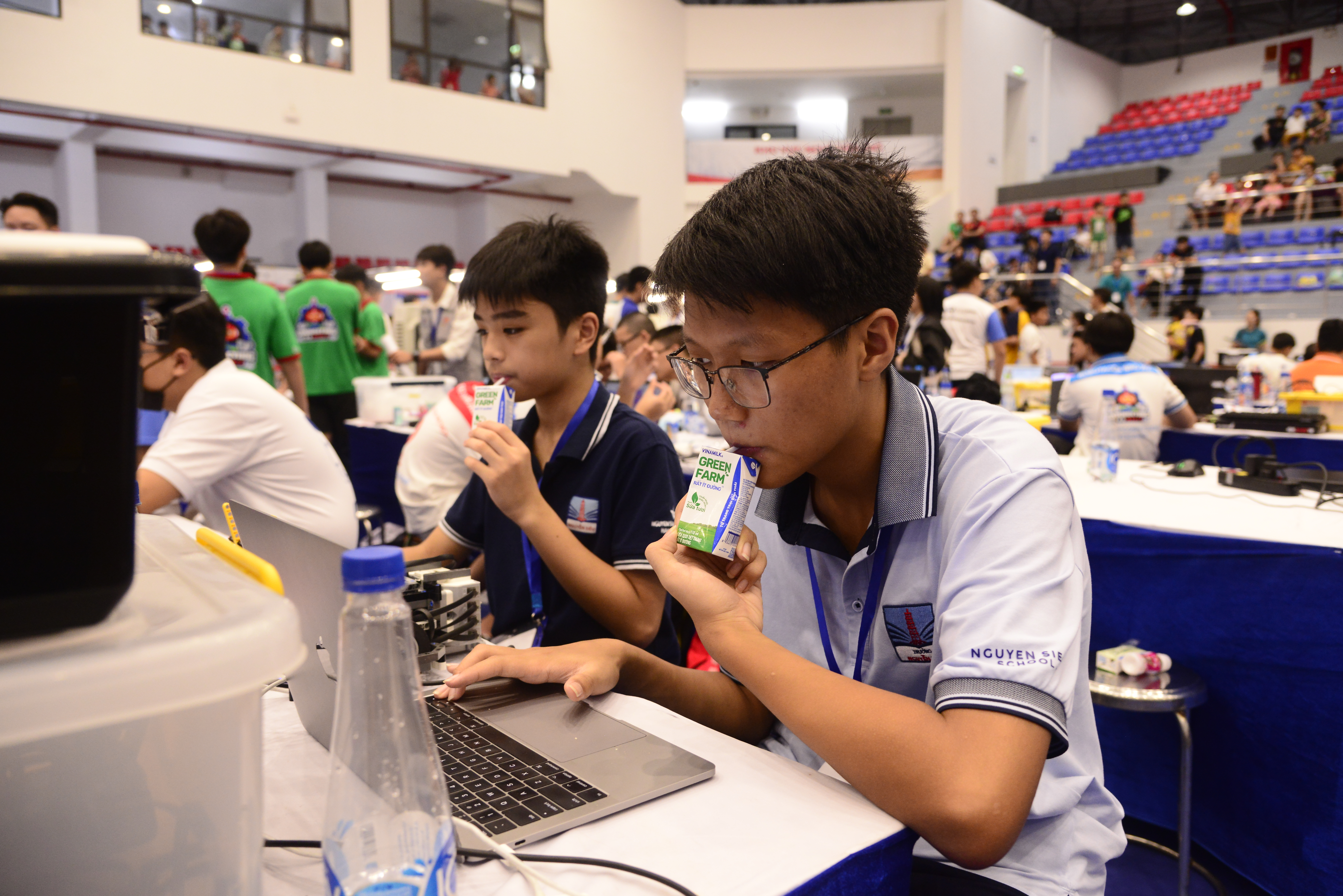 Ở bảng B5, để chuẩn bị cho màn giao tranh trên sa bàn, Quang Minh đã nạp thêm năng lượng từ sữa ngon tinh khiết Vinamilk Green Farm, tiếp sức cho em cùng đồng đội đến từ THCS Hồng Bàng (TP.HCM) chiến thắng thuyết phục ở phần thi đấu robot quần vợt.