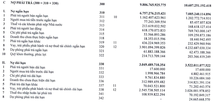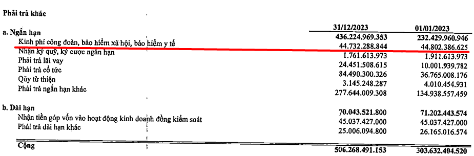 Đáng chú ý, tại khoản mục phải trả ngắn hạn khác ghi nhận Công ty đang nợ kinh phí công đoàn, bảo hiểm xã hội, bảo hiểm y tế hơn 44,7 tỷ đồng, phải trả lãi vay và cổ tức lần lượt 24,4 tỷ đồng và 84,5 tỷ đồng.