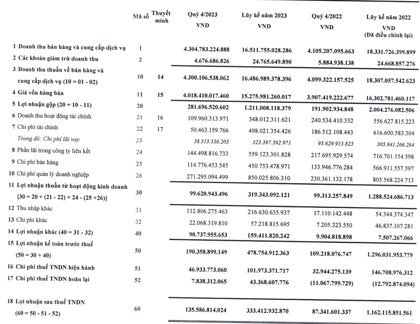 Nhờ khoản lợi nhuận khác tăng vọt từ 7,5 tỷ đồng lên hơn 159,4 tỷ đồng, Tập đoàn Dệt May Việt Nam báo lãi sau thuế 333.4 tỷ đồng. Tuy nhiên con số này vẫn 'đi lùi' hơn 71% so với kết quả ghi nhận năm 2023.