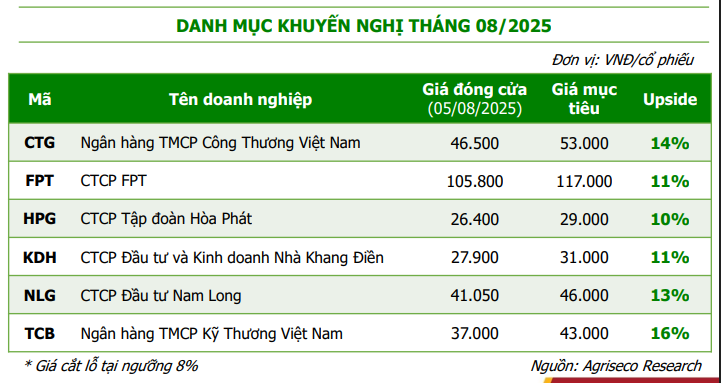 Dựa trên phân tích đó, Agriseco Research đã công bố danh mục khuyến nghị cho tháng 8/2025 gồm các cổ phiếu như: CTG (Ngân hàng Công Thương Việt Nam), FPT, HPG (Hòa Phát), KDH (Khang Điền), NLG (Nam Long) và TCB (Techcombank). Đây đều là những doanh nghiệp đầu ngành với tình hình tài chính lành mạnh, triển vọng tăng trưởng tốt và đang giao dịch ở mức định giá hợp lý.