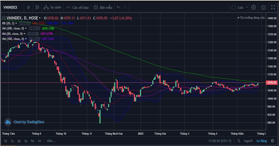 Theo báo cáo "La bàn đầu tư tháng 6" của Chứng khoán VNDirect, tính đến ngày 25/05/2023, VN-INDEX chốt tại mức 1.064,6 điểm, tăng 1,5% so với đầu tháng và 5,7% kể từ đầu năm. Hiện tại, chỉ số VN-INDEX đang giao dịch tại mức 0,8 lần P/E trung bình 5 năm và 0,7 lần P/B trung bình 5 năm.