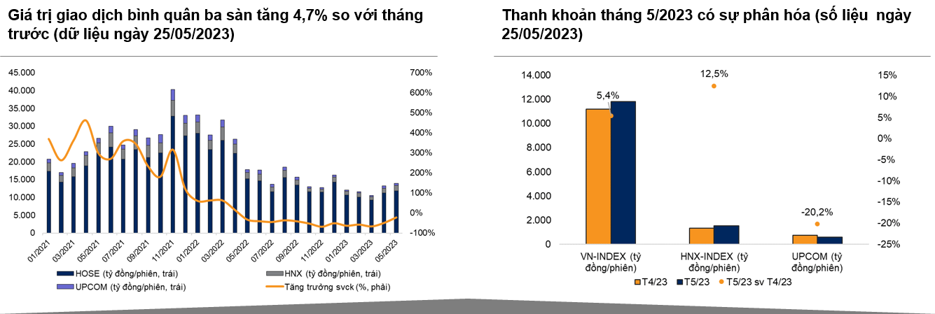 Dòng tiền trong nước có dấu hiệu quay trở lại kênh chứng khoán trong bối cảnh lãi suất có xu hướng giảm rõ rệt. Giá trị giao dịch bình quân ba sàn tăng 4,7% so với tháng trước (-28,1% so với cùng kỳ) lên 13.905 tỷ đồng/ngày giao dịch (HOSE: 11.805 tỷ đồng/ngày giao dịch, +5,4% so với tháng trước; HNX: 1.514 tỷ đồng/ngày giao dịch, +12,5% so với tháng trước; UPCOM: 584 tỷ đồng/ngày giao dịch, -20,2 so với tháng trước).