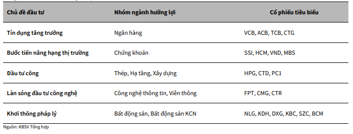 Cho tháng 3, KBSV duy trì phần lớn các kỳ vọng đối với các chủ đề đầu tư đã đề cập trong báo cáo tháng 2. Bên cạnh đó, nhóm phân tích nhận thấy nhóm cổ phiếu bất động sản đang mở ra cơ hội đầu tư đáng chú ý, nhờ các kỳ vọng liên quan đến việc tháo gỡ vướng mắc pháp lý, đẩy nhanh quá trình giải quyết các rào cản và thúc đẩy hoạt động mở bán dự án.