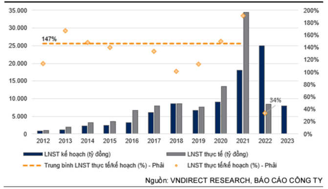 Năm 2022 là năm đầu tiên sau 10 năm, HPG không hoàn thành kế hoạch lợi nhuận sau thuế được Đại hội cổ đông giao. Trong giai đoạn 2012-2021, HPG thường xuyên vượt kế hoạch lợi nhuận sau thuế với mức trung bình là 47%. Do đó, VNDirect tin rằng kế hoạch kinh doanh năm 2023 đã được lập trên cơ sở thận trong của ban lãnh đạo công ty, đặc biệt trong bối cảnh giá nguyên liệu đầu vào biến động và nhu cầu thép yếu như hiện nay. Kết quả kinh doanh kém khả quan trong năm 2022 và chi phí đầu tư lớn trong năm 2023-2024 cho Khu liên hợp gang thép Dung Quất giai đoạn 2, HPG cũng sẽ không trả cổ tức tiến mặt trong năm 2023.