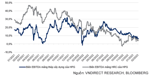 Theo diễn biến của giá hàng hóa giao ngay (bao gồm giá thép, quặng sắt, than cốc và thép phế), VNDirect ước tính biên EBITDA của HPG trong quý 1/2023 thấp hơn 1,8 điểm % so với quý 4/2022. Với nhu cầu yếu, VNDirect lo ngại về khả năng chuyển rủi ro tăng giá nguyên liệu đầu vào của HPG sang phía người tiêu dùng cuối cùng. Bên cạnh đó, hiệu suất vận hành nhà máy thấp trong nửa đầu năm 2023 cũng sẽ tác động tới biên lợi nhuận của công ty. Do đó, VNDirect dự phóng lợi nhuận ròng của công ty có thể vẫn sẽ âm trong Q1/23.