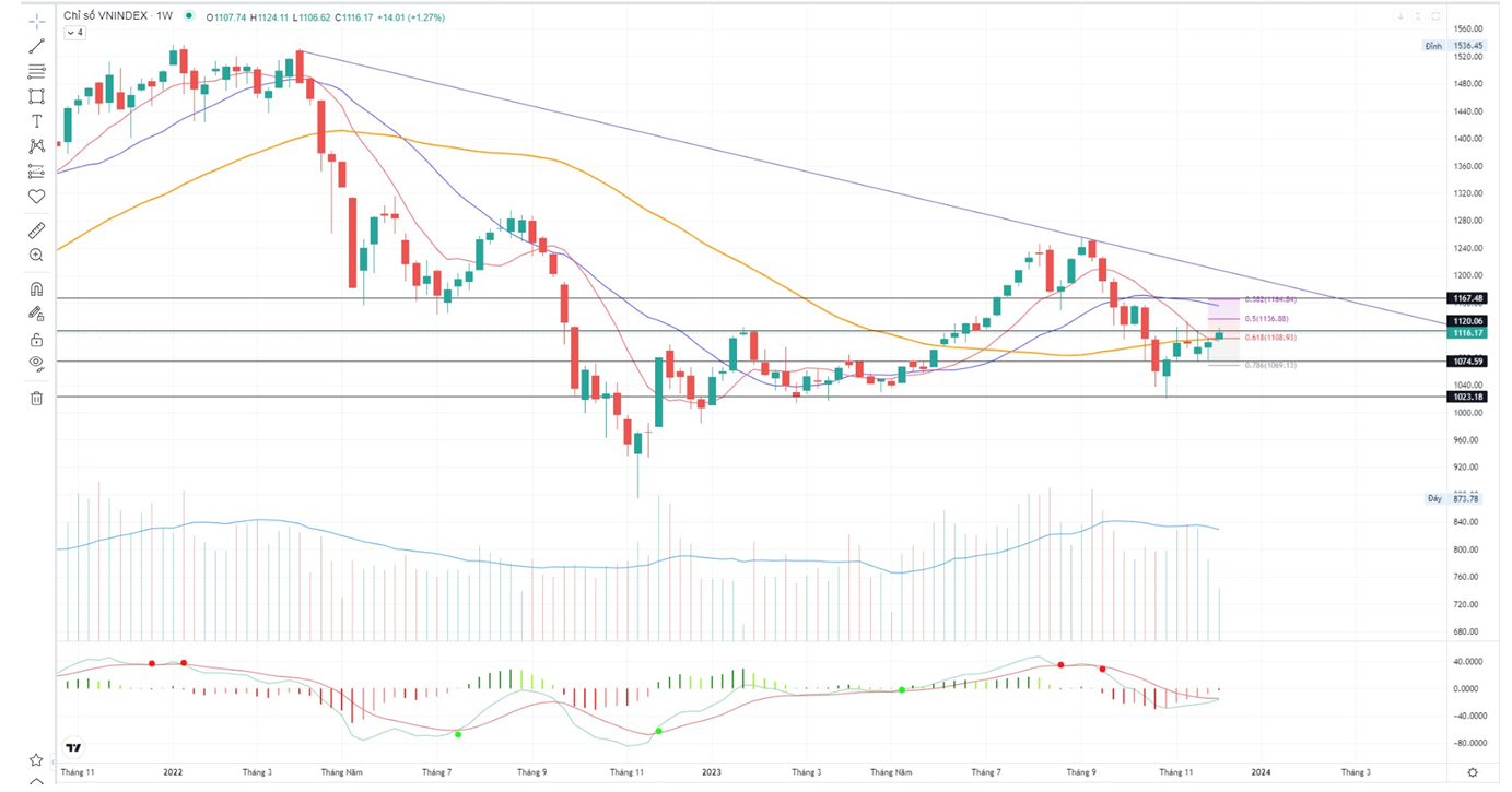 Thị trường chung điều chỉnh từ đỉnh trung hạn 1255 về 1020 trong vòng 8 tuần trong tháng 9 và tháng 10 với biên độ giảm 230 điểm. Tại đây, thị trường có nhịp hồi phục đầu tiên với 11 phiên, biên độ 100 điểm, thanh khoản giao dịch ở mức thấp (11-14 ngàn tỷ đồng). Đến hiện tại thị trường tạo vùng đi ngang ở trong khoảng 1075-1130. Đường giá vận động ở quanh đường MA50 trên biểu đồ tuần. Về mặt cấu trúc, thị trường đang hình thành trên biểu đồ 1H tạo ra đáy nâng cao dần ủng hộ cho kỳ vọng có nhịp hồi phục ngắn hạn tiếp theo, với khối lượng giao dịch thấp thể hiện sự tâm lý thận trọng của nhà đầu tư sau giai đoạn thị trường sụt giảm mạnh.