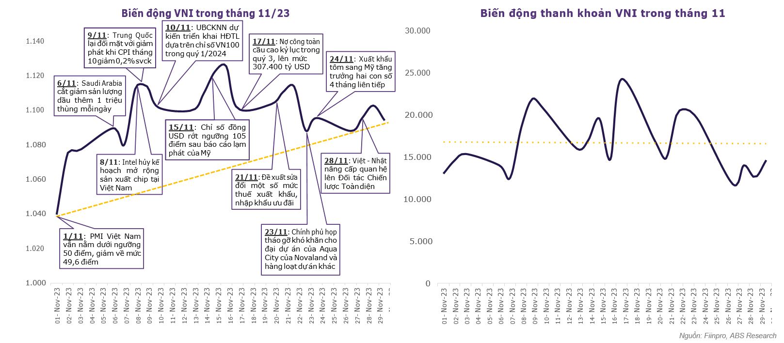 VNIndex trong tháng 11 đã có sự hồi phục tương đối tích cực. Kết thúc phiên cuối tháng, VNIndex đóng cửa với mức tăng +65,94 điểm, tương ứng +6,4% so với cuối tháng trước lên mốc 1.094,13 điểm. Động lực tăng chủ yếu đến từ nhóm Chứng khoán, Vật liệu xây dựng, Hóa chất, Tài nguyên cơ bản... Trung bình GTGD/phiên có sự cải thiện lên 16.704 tỷ đồng/phiên, tăng 16,1% so với số liệu tháng 10 phản ánh các dòng tiền vào “bắt đáy”.