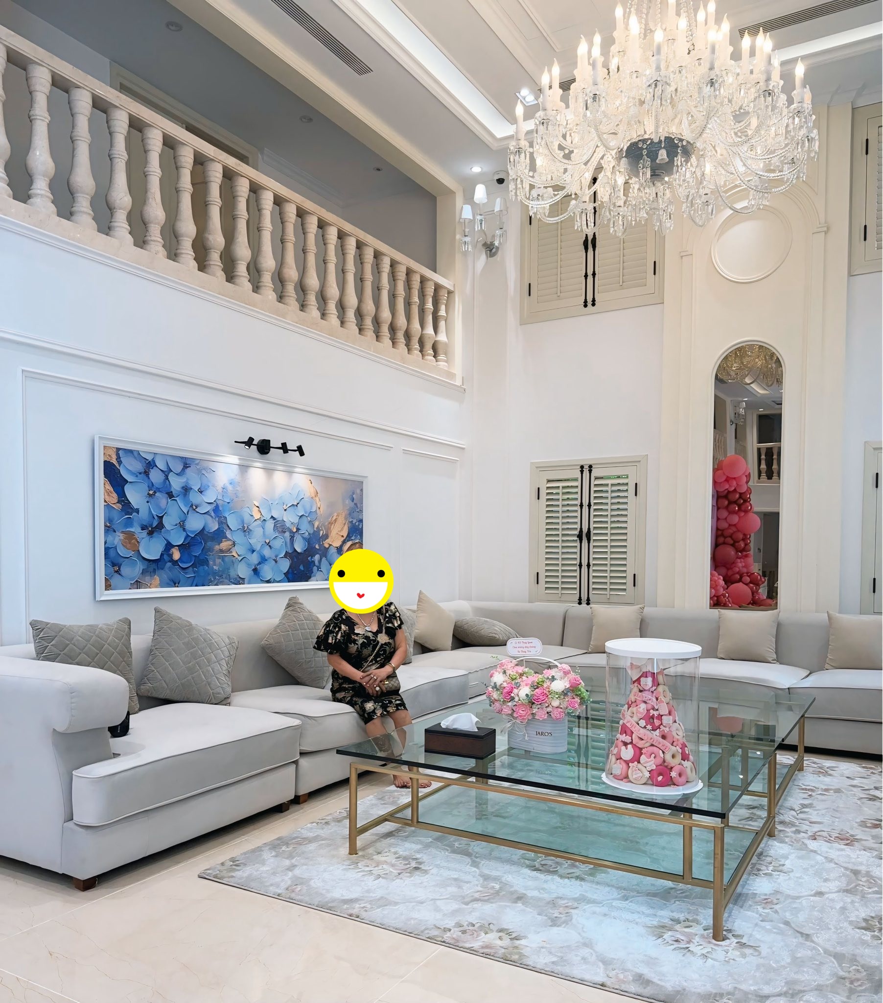 Buổi tiệc được diễn ra tại biệt thự riêng của gia đình Lê Phương. Cơ ngơi của hoa hậu quý bà tọa lạc tại một vị trí đắc địa, có diện tích lên đến 600m2. Ngôi nhà gồm 5 tầng, có tông màu trắng chủ đạo với nội thất được thiết kế tỉ mỉ, sang trọng. Ước tính, căn biệt thự có giá trị hơn 200 tỉ đồng.