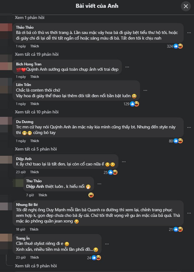 Chính phong cách đặc biệt này của nàng WAG đã trở thành chủ đề tranh cãi. Nhiều người cho rằng, Quỳnh Anh chỉ đang làm "content" thôi chứ không thể nào có cách ăn mặc "đặc biệt" đến như vậy. Tuy nhiên cũng có người ra mặt bảo vệ, cho rằng bỏ qua việc ăn mặc, hãy nhìn vào những hành động thiết thực mà vợ chồng cô đã và đang làm.