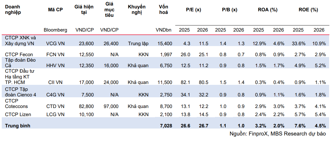 Trong bối cảnh triển vọng lợi nhuận cải thiện và backlog tăng mạnh, mức định giá này được đánh giá là hấp dẫn, tạo dư địa tăng giá cho cổ phiếu. Theo đó, MBS đưa ra khuyến nghị “Khả quan” đối với CTD, CII và HHV, trong khi giữ quan điểm “Trung lập” với VCG do yếu tố lợi nhuận suy giảm trong ngắn hạn.