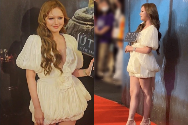 Mỹ nhân 2k2 xuất hiện tại sự kiện với thiết kế màu trắng khoét sâu hoắm, khoe vòng 1 căng tràn. Kể từ ngày hẹn hò Gil Lê, Xoài Non được nhận xét có sự táo bạo hơn hẳn trong gu ăn mặc, điều mà trước đây cô nàng "tem tém" hơn rất nhiều.