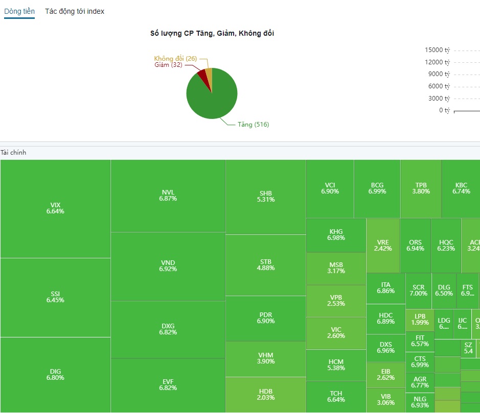 Tâm lý hưng phấn khiến sắc tím bao phủ toàn thị trường trong đó VIX, DIG, NVL, VND, DXG, EVF, HSG, CII, PDR, VIC, BCG…tăng hết biên độ.