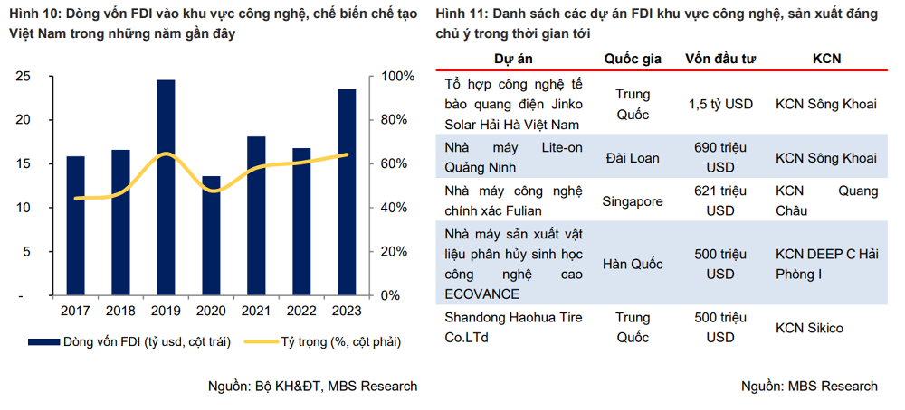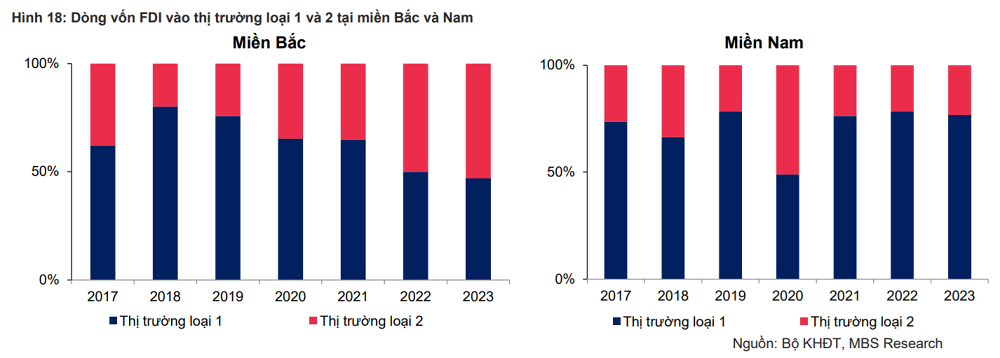 Số liệu từ Chứng khoán MBS, tỉ trọng dòng vốn FDI vào thị trường loại 2 từ 2018 đến nay ghi nhận mức tăng rõ rệt, từ mức 20% trong năm 2018 lên mức 53% trong năm 2023. Điều này là do giá thuê đất khu công nghiệp tại thị trường loại 2 thấp hơn 20% so với thị trường loại 1, diện tích đất thương phẩm còn lại nhiều (tỉ lệ lấp đầy thị trường loại 2 mới chỉ đạt 64%).