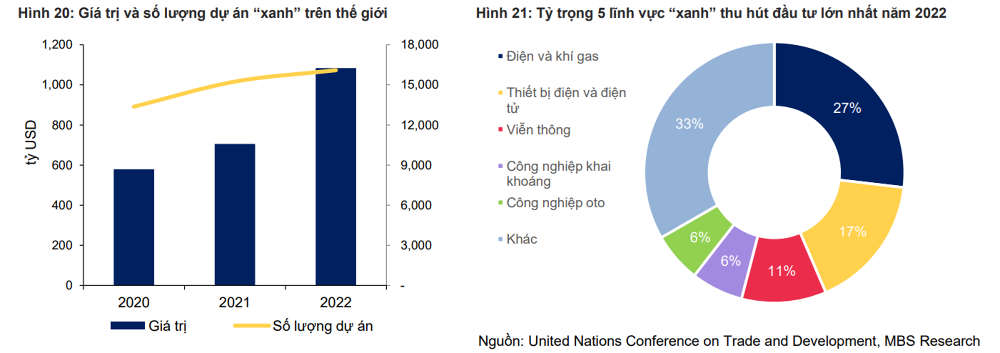 “Không nằm ngoài xu hướng chung, các quốc gia Đông Nam Á đang tập trung thu hút vào ngành công nghiệp “xanh”, số lượng dự án “xanh” tăng trưởng năm 2021, 2022 lần lượt là 12% và 21%. Indonesia thu hút đầu tư vào chuỗi sản xuất xe điện (EV), Singapore tập trung vào ngành chất bán dẫn và công nghệ 4.0, Thái Lan phát triển ngành điện tử, còn Việt Nam mới ở giai đoạn đầu trong thu hút đầu tư “xanh””, MBS nhận định.