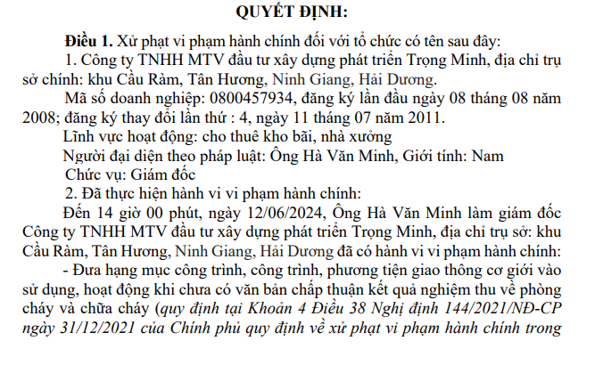 Tại Quyết định số 1480/QĐ-XPHC ngày 18/6/2024 về việc xử phạt vi phạm hành chính đối với Công ty TNHH MTV đầu tư xây dựng phát triển Trọng Minh tại khu Cầu Ràm, Tân Hương, Ninh Giang, Hải Dương. Số tiền phạt là 80.000.000 đồng do có hành vi đưa hạng mục công trình, phương tiện giao thông cơ giới vào sử dụng, hoạt động khi chưa có văn bản chấp thuận kết quả nghiệm thu về phòng cháy và chữa cháy; Buộc thực hiện việc nghiệm thu về phòng cháy, chữa cháy.