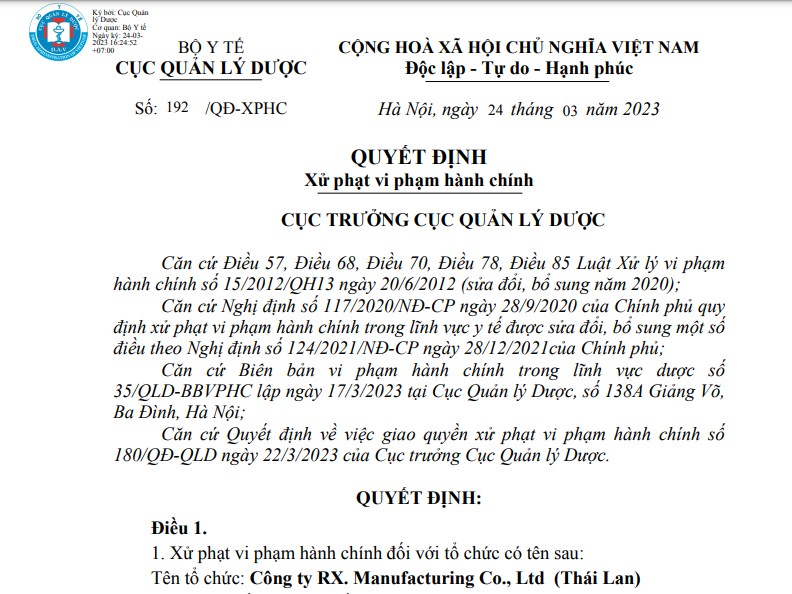 Ngày 24/3, Cục Quản lý Dược (Bộ Y tế) ban hành Quyết định số 192/QĐ-XPHC về việc xử phạt vi phạm hành chính (Công ty RX. Manufacturing Co., Ltd (Thái Lan), Đại diện chấp hành quyết định xử phạt vi phạm hành chính là Công ty TNHH Thương mại Dược phẩm Úc Châu).