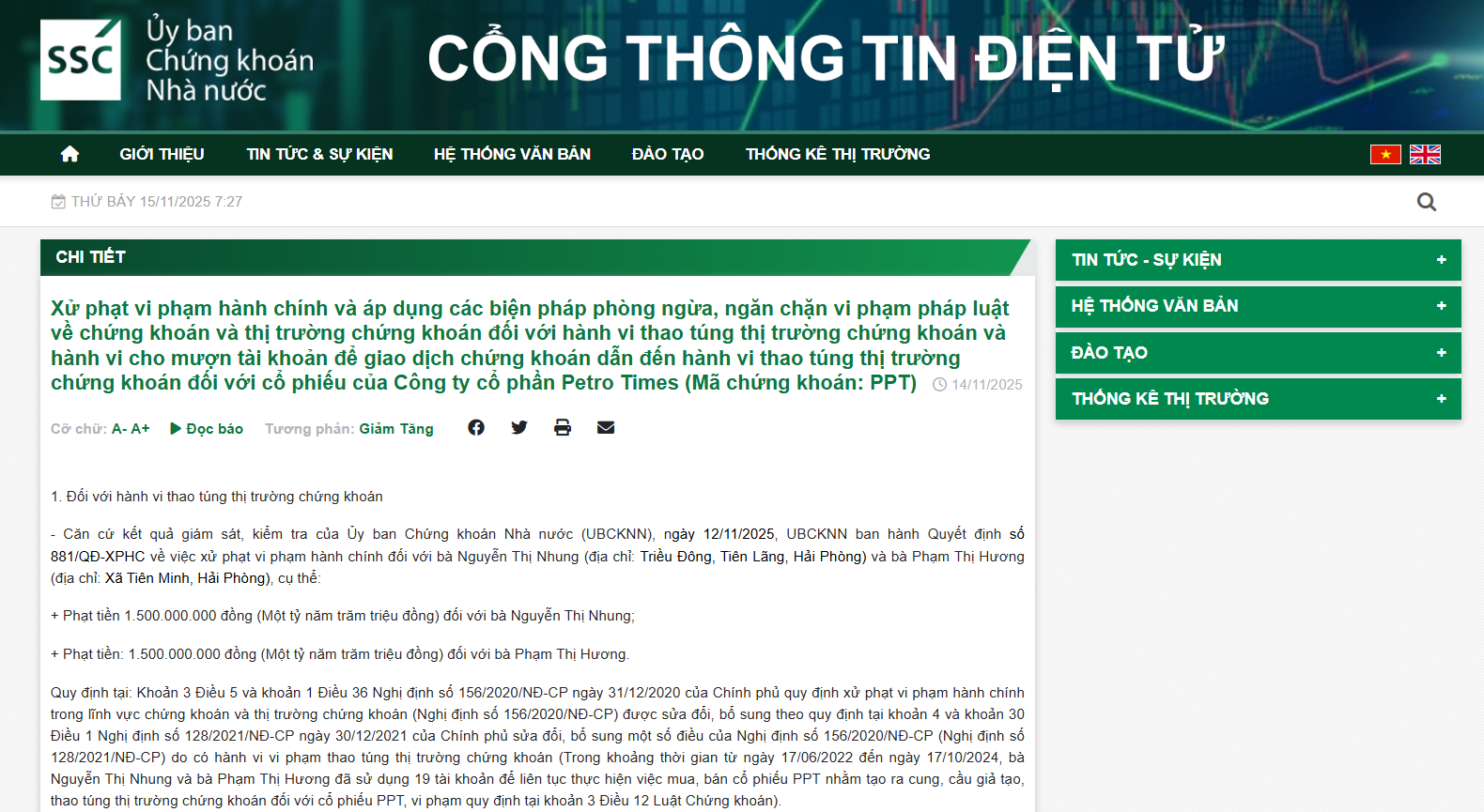 Ủy ban Chứng khoán Nhà nước (UBCKNN) vừa ban hành loạt quyết định xử phạt vi phạm hành chính và áp dụng các biện pháp phòng ngừa đối với 17 cá nhân liên quan đến hành vi thao túng cổ phiếu PPT của Công ty cổ phần Petro Times (PPT).