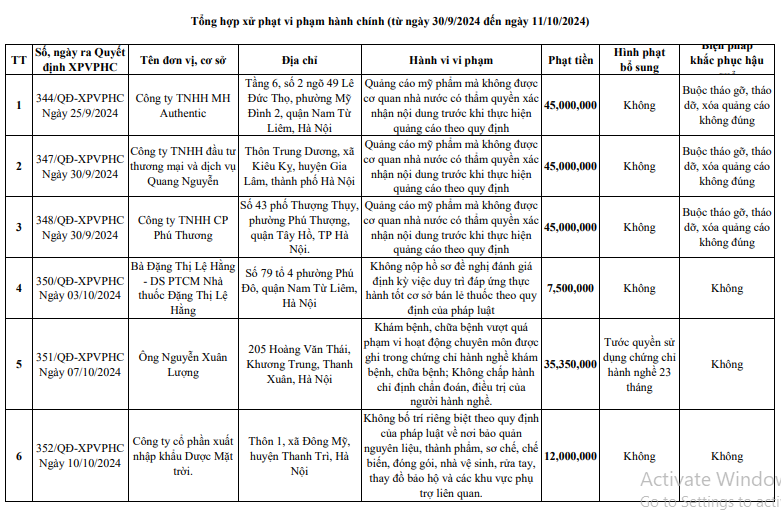Cụ thể, Thanh tra Sở Y tế Hà Nội xử phạt Công ty TNHH MH Authentic (Tầng 6, số 2 ngõ 49 Lê Đức Thọ, phường Mỹ Đình 2, quận Nam Từ Liêm, Hà Nội) 45 triệu đồng do quảng cáo mỹ phẩm mà không được cơ quan nhà nước có thẩm quyền xác nhận nội dung trước khi thực hiện quảng cáo theo quy định.