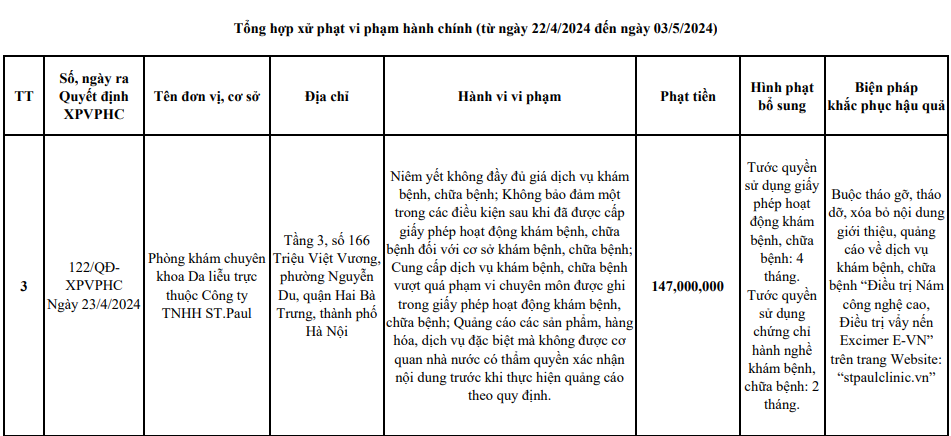 Cụ thể, Sở Y tế Hà Nội đã có Quyết định số 122/QĐXPVPHC Ngày 23/4/2024, xử phạt vi phạm hành chính đối với Phòng khám chuyên khoa Da liễu trực thuộc Công ty TNHH ST.Paul (Tầng 3, số 166 Triệu Việt Vương, phường Nguyễn Du, quận Hai Bà Trưng, thành phố Hà Nội).