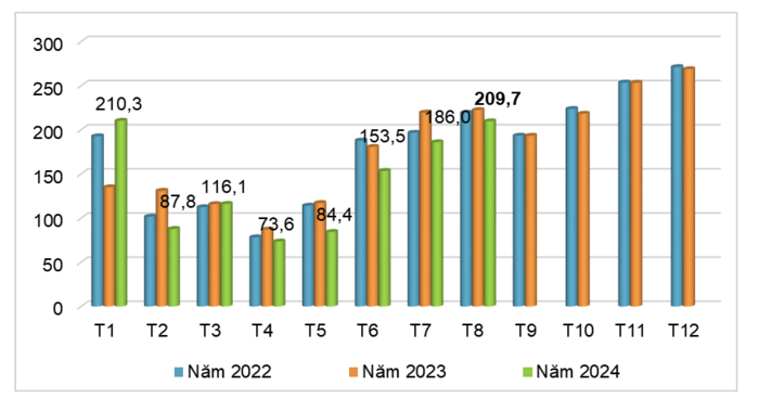 Theo số liệu thống kê của Tổng cục Hải quan, tháng 8, xuất khẩu cao su của Việt Nam đạt 209,72 nghìn tấn. So với cùng kỳ năm ngoái, xuất khẩu cao su giảm 5,7% về lượng, nhưng tăng 20,2% về trị giá. Đây là tháng thứ 5 liên tiếp lượng cao su xuất khẩu giảm so với cùng kỳ năm 2023.