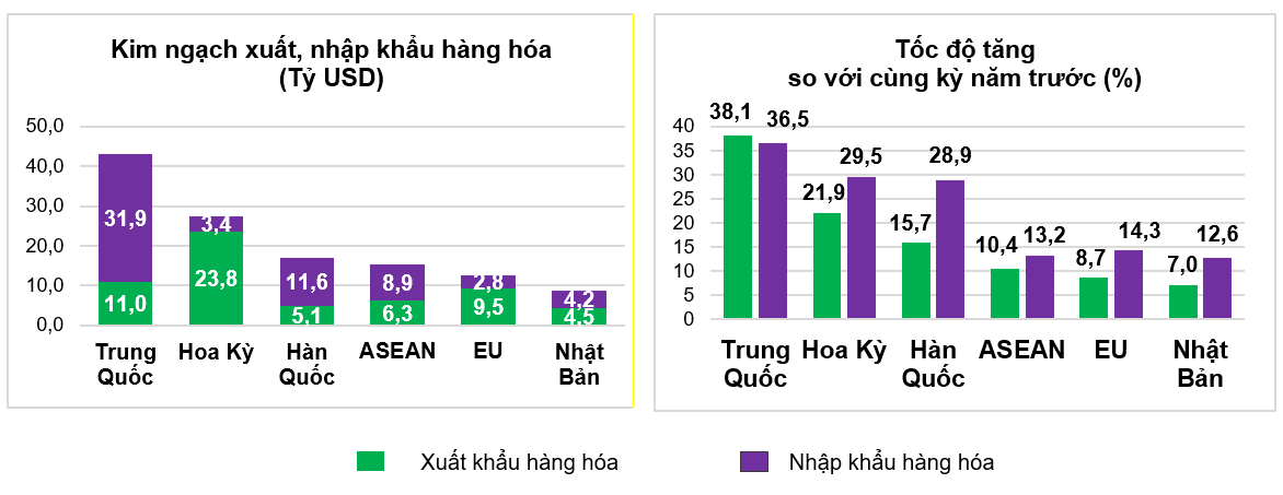 Trong giai đoạn này, Việt Nam xuất siêu sang Hoa Kỳ 20,4 tỷ USD, tăng 20,8% so với cùng kỳ năm trước; xuất siêu sang Liên minh châu Âu (EU) đạt 6,7 tỷ USD, tăng 6,5%; xuất siêu sang Nhật Bản đạt 0,3 tỷ USD, giảm 43,1%.