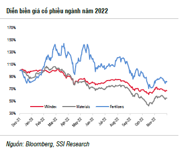 Trong đó, DPM là cổ phiếu khả quan nhất với giá cổ phiếu chỉ giảm 4% so với đầu năm do chính sách chi trả cổ tức với tỷ lệ cao (lên đến 70% mệnh giá, tỷ suất cổ tức đạt 16%) và tăng trưởng lợi nhuận vững chắc. Kém hiệu quả nhất là các công ty sản xuất NPK (giá cổ phiếu BFC và LAS lần lượt giảm 43% và 61% so với đầu năm), những công ty gặp khó khăn khi chi phí nguyên liệu thô nhập khẩu tăng lên trong năm 2022.